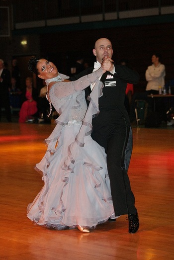 Zeer aparte zilvergrijze ballroom jurk, gedecoreerd met lichtblauwe en zachtroze kanten applicaties en stenen. Inclusief floats en... | € 375.00 Fixed price | |  | Ballroom dress Netherlands 26-05-2010 |