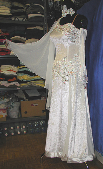 Description chique witte ballroomjurk, met veel kant en 30 gross multicolour strass. Inclusief haarstukje, handschoen en ketting van kant. Doe een bod!