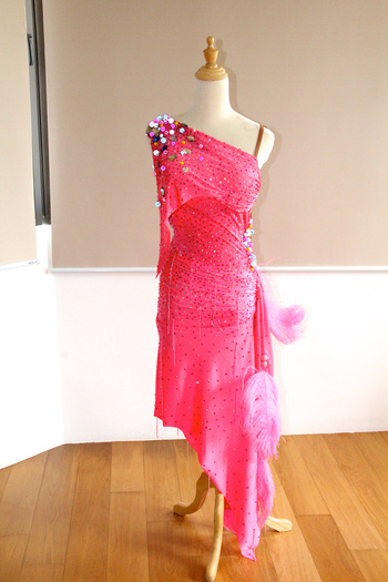 Description The best features of this dress are its attractive pink color (very eye-catching on the floor) and its flattering shape. The skirt opens at the side during spins and creates beautiful movement. The bare-back and hip-hugging skirt create a sexy silhouette.