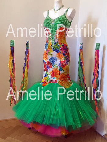 | | Owner | Amelie | | Location | Czech Republic | | Telephone | 420776440740 | | Advert clicks | 468 | | | | | Type | Ballroom dress | | Color | green and printed | | Size | S-M | | Price | € 1400.00 EURO | | Price Type | Fixed price | | Condition | New | | Link | http://www.ameliepetrillo.com | | | | | Description | new dress. top in green lycra and flowerprint, skirt with 7layers with different colors of crinoline. decorated with swarovski crystals and sew on swarovski stones. amazing volume with multicolor effect.