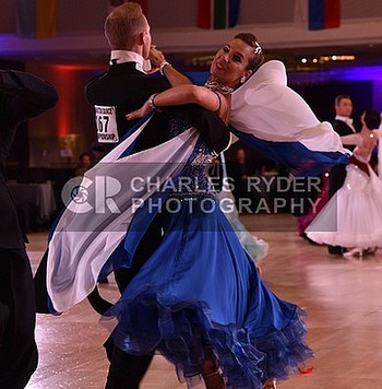 Bright blue chiffon Lycra ballroom dress with heavily-stoned lace bodice and chiffon floats. Three-layer skirt with horsehair bottom. Floats and skirt have big flow when moving. Very comfortable to wear. More Pictures available.