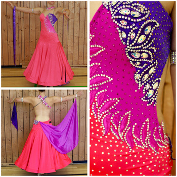 Description Striking Ballroom dress up for sale. Includes two pairs of floaters and big bracelets all with SS16 stones. Also many big sew-on stones also in crystal AB. The skirt creates big volume and is made out of three skirts in red purple pink. Please contact for more Information pictures videos.