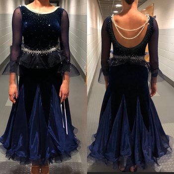 Stunning dark blue dress with white pearls. Chrisanne fabrics and swarovski stones.